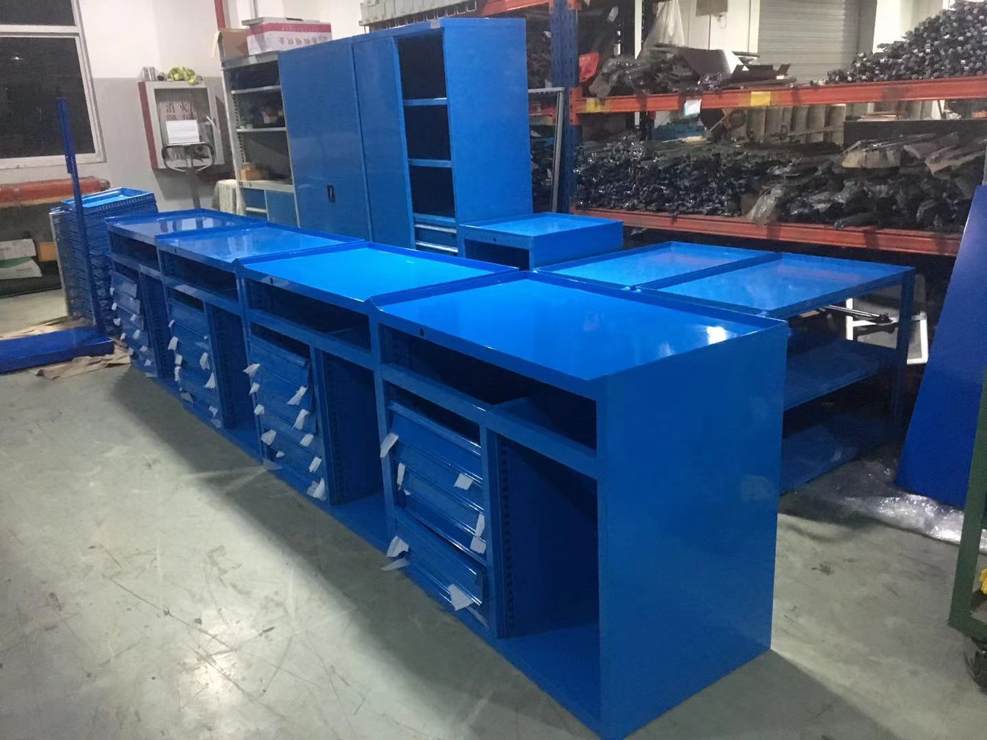 工具車適用于工具、刀具、零部件在生產現場中的定置管理,使您的物品存取工作真正做到準時、準確、高效、低耗。 結構特點 編輯 1、 高強度的結構設計和噴粉表面處理工藝,能適應工廠較復雜的工作環境。 2、 裝有優質軸承和導軌,保證抽屜承受額定載荷時亦能輕松順暢開合。 3、 根據需要可自由選擇配置不同高度的抽屜,充分滿足生產現場的需要。 4、 可以配置帶有防油膠墊的頂框,保護放置物品不受損害以及防止物品滑落。 5、 鎖具先進,只用一把鎖就能鎖上所有的抽屜,保證物品安全。 6、 柜體底部配有墊腳,保護柜體在放置或移動時不受損壞,方便用叉車搬運。 多種表面顏色,滿足生產現場整體布置的需求 7. 全寬型鋁合金抽屜把手及可更換的標簽,美觀、方便、實用。 8. 先進的抽屜安全扣設計,保證抽屜在關閉后不會意外滑出。 9. 更有4種國際標準色以供選擇(ral5005,ral5015,ral6011,ral7035),滿足生產現場整體布置的需要。 10. 采用國際先進水平鎖具,只一把鎖就能鎖上所有抽屜,保證物品安全。 11. 加底框及高品質的腳輪,推行平穩,方向性好,剎車固定后不會滑動。 12. 先進的互鎖裝置,在打開一個抽屜時其他抽屜自動鎖死不能打開,防止抽屜全部打開造成柜體傾斜。 13.工具車的工作臺面采用獨特的注塑成型,強度更高。 14.中央鎖采用環形鎖匙結構,可延長鎖的使用壽命。 15.工具車四角都配有新型復合材料制成的防撞條,能有效的緩沖意外碰撞造成的損害。 16.工具車的重型車輪,125MM直徑更容易跨越障礙物。 17.臺面有特殊的小凹槽,可用來盛放黃油等液體,方便使用。 18.工具車抽屜內可以存放豐富的工具模塊。 19.抽屜兩側采用疊加式滾珠滑軌,具有優秀的順暢度。 20.工具車的每個抽屜擁有自鎖功能。 21.工具車兩側采用網孔板內加鋼板的雙層鋼板設計,使車體更加堅固,持久耐用。 工具車與工具柜的區別 工具車是可以移動的工具柜,適合在生產現場安全、合理地運送工具和配件。 工具車由各種型號的工具柜增加頂柜和腳輪等移動部件組成。 工具車的外型尺寸的高度:重型工具車為所選用的工具柜的高度加上140mm;輕型工具車為所造工具柜高度加上80mm。高強度的結構設計和陰極電泳底漆表面處理工藝,能適應工廠較復雜的工作環境。